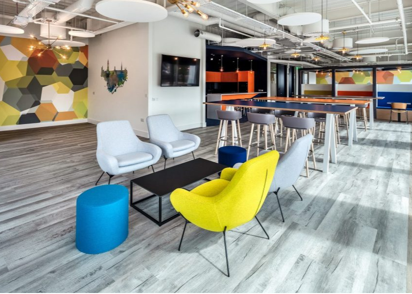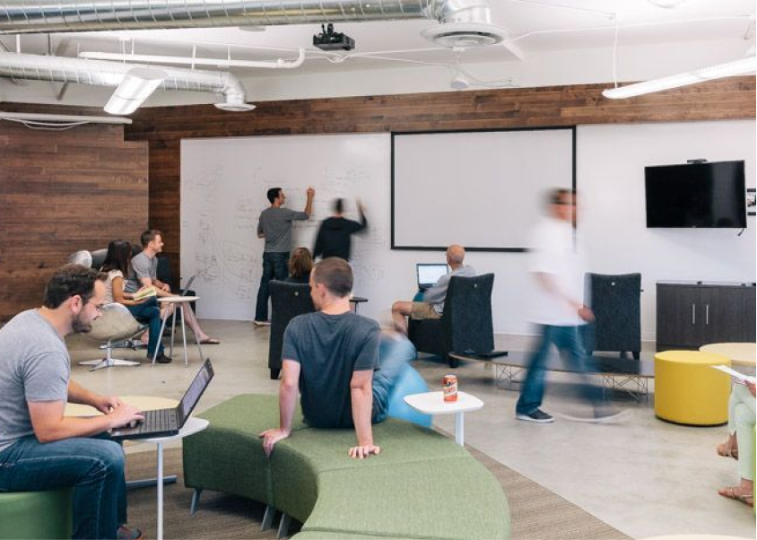 Large and flexible spaces designed to support meetings and presentations with higher headcounts than traditional conference rooms, or in configurations that rearrange to meet the needs of the specific group using the space.